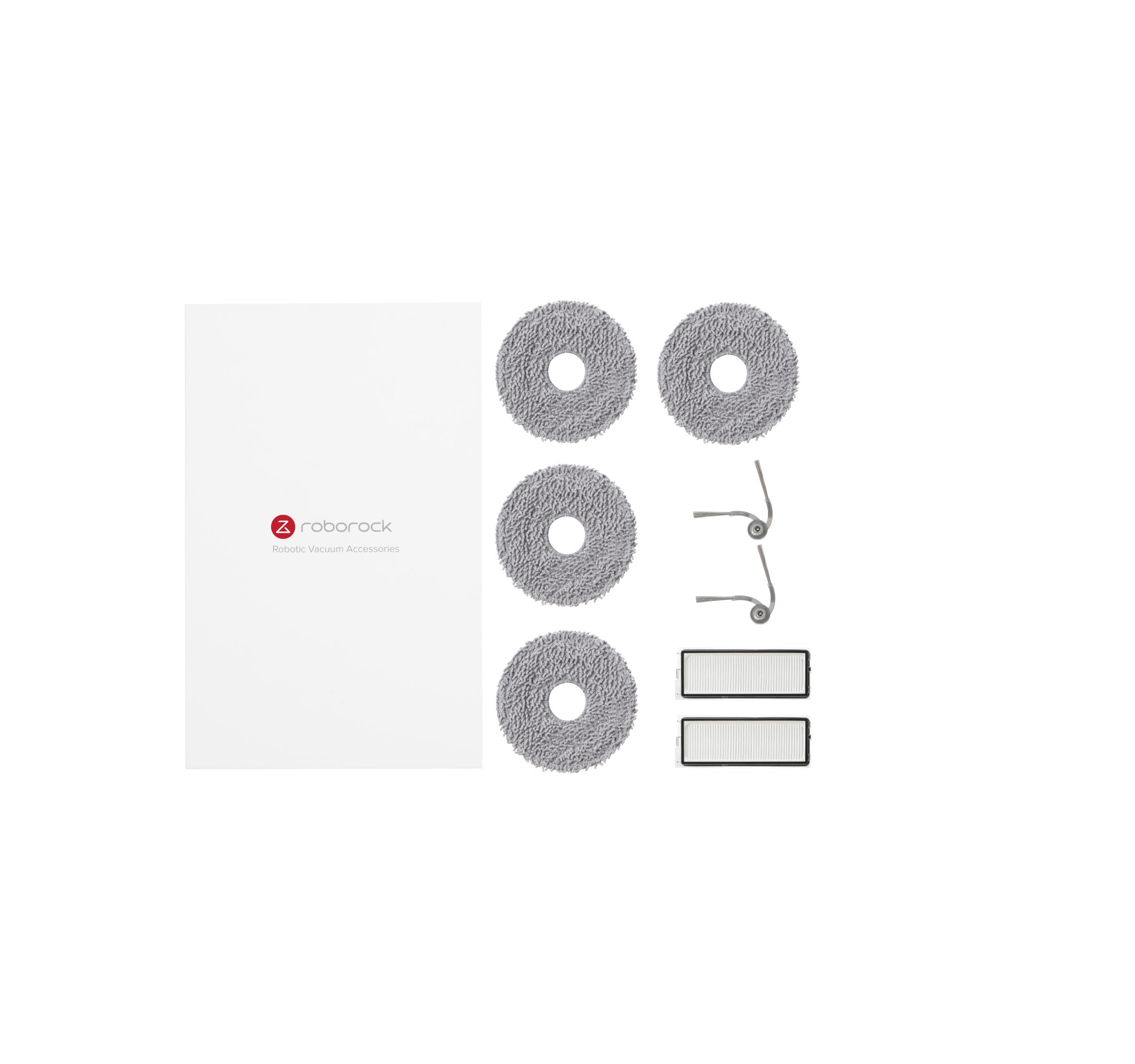 Originalus Xiaomi Roborock QRevo Curv/ Edge priedų rinkinys, į kurį įeina: 2 filtrai, 4 šluostės ir 2 juodi šoniniai šepetėliai.