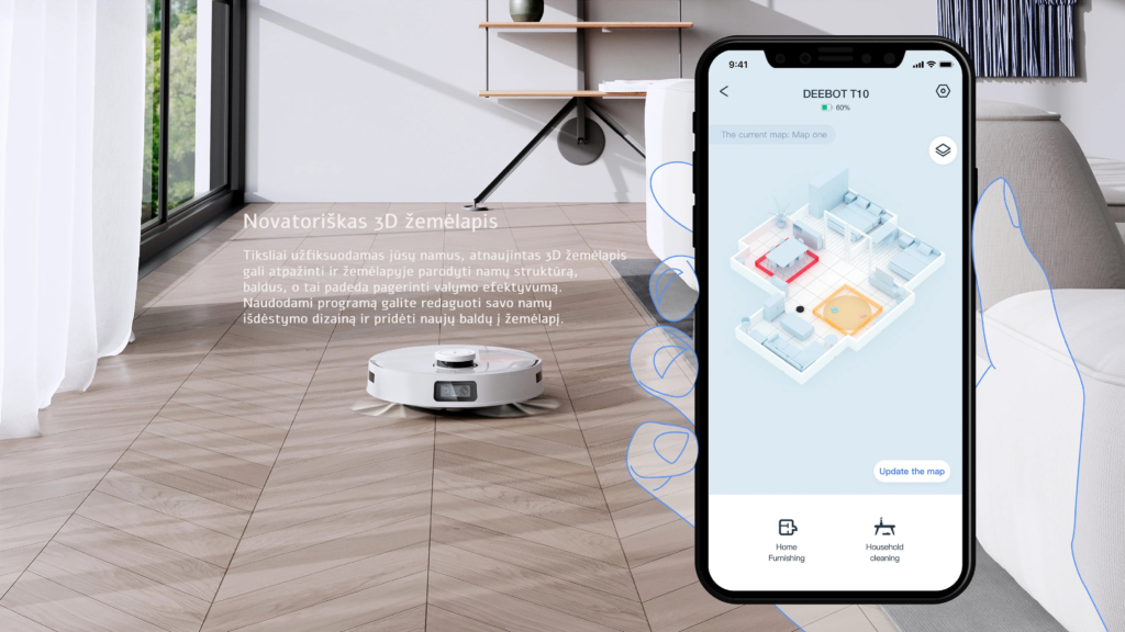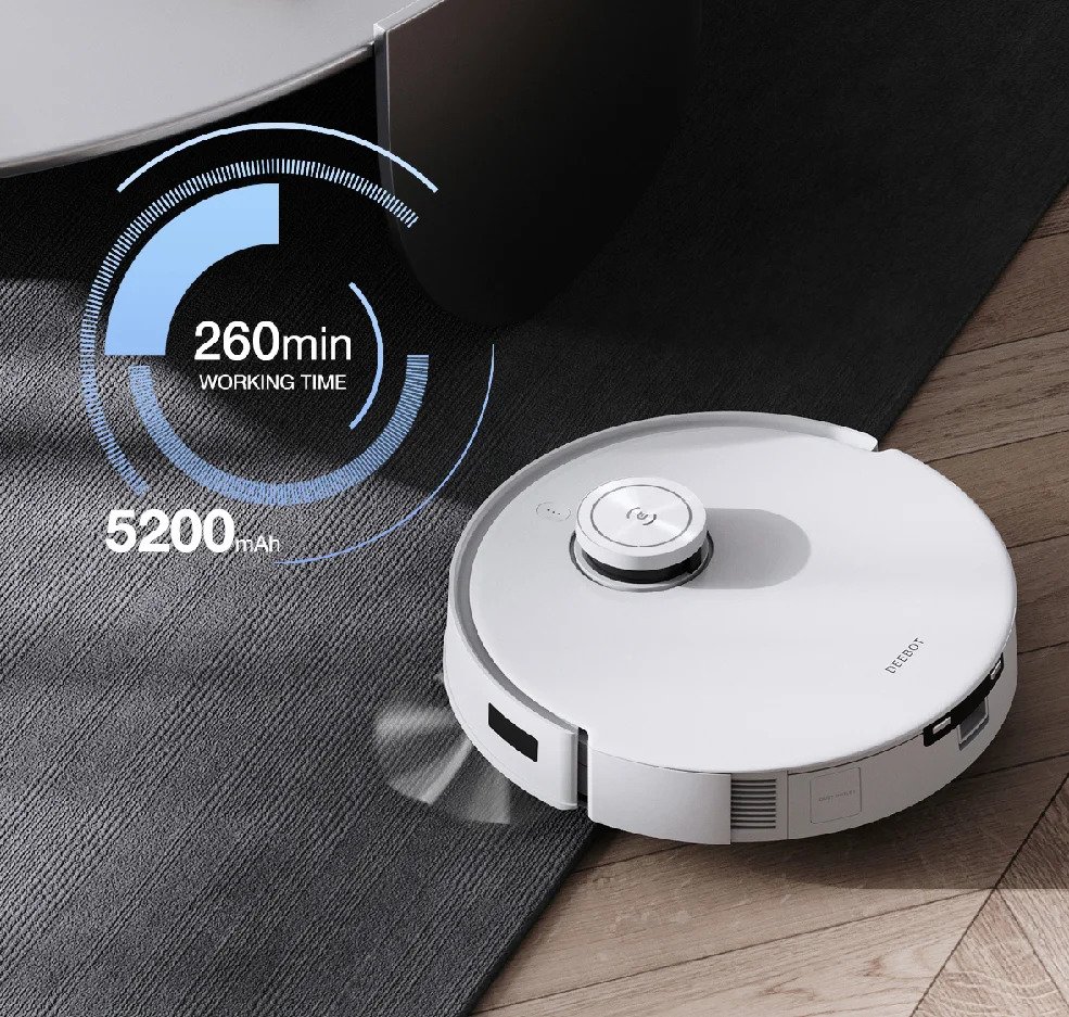 Į DEEBOT T10 įmontuota 5200 mAh ličio baterija, kuri užtikrina ilgesnį veikimo laiką.