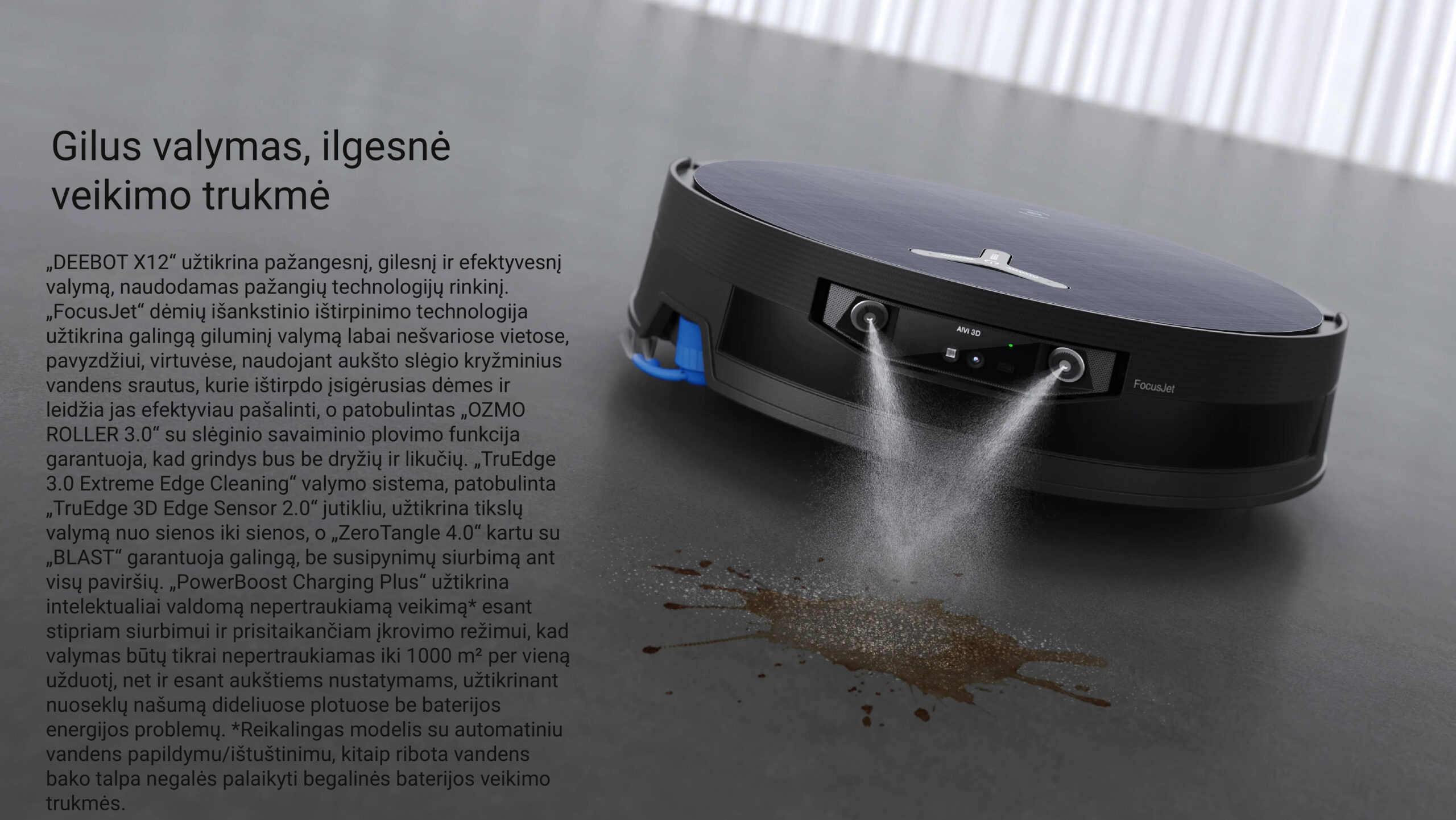 „DEEBOT X12“ pristato visiškai naują „FocusJet“ dėmių išankstinio ištirpinimo technologiją. Sukurta kovoti su lipniomis, įsigėrusiomis dėmėmis, ji užtikrina gilesnį ir veiksmingesnį valymą, taikydama pritaikytus sprendimus trijuose scenarijuose. Pirma, labai nešvariose vietose, pavyzdžiui, virtuvėse, vartotojai gali aktyvuoti valymą per „AGENT YIKO“, nurodydami „DEEBOT“ pirmiausia išsiurbti grindis, tada purkšti kryžminius vandens srautus 46 000 Pa stiprumu lanko formos modeliu, kad iš anksto suminkštintų sunkiai pašalinamas nešvarumus, ir galiausiai naudoti didelio sūkių skaičiaus „OZMO ROLLER“ su tinkleliu, kad be vargo pakeltų ir pašalintų sunkiai pašalinamas liekanas, pavyzdžiui, išdžiūvusią kavą. Be to, vartotojai „ECOVACS Home“ programėlėje gali nurodyti konkrečias zonas, pavyzdžiui, vietas, pažymėtas purvinomis naminių gyvūnų pėdsakais, ir įjungti lanko formos purškimą, po kurio seka tinkleliu formos šluostymas, skirtas tikslingam valymui. Trečia, „DEEBOT“ gali automatiškai aptikti išdžiūvusias dėmes ir įjungti tikslingą purškimą bei šluostymą.