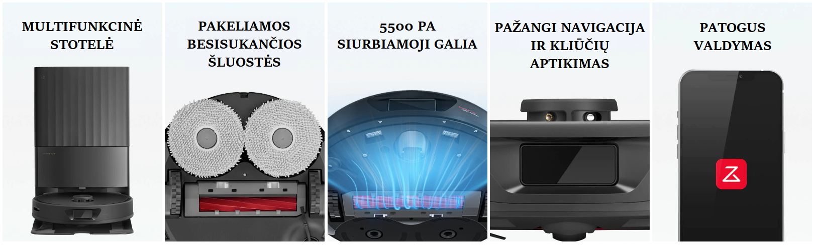 Šluostymas ir siurbimas vienu valymu – naudodami 7 mm automatinį šluostės pakėlimą, galite lengvai išvalyti kilimus ir grindis to paties valymo ciklo metu. Šluostės automatiškai pakeliamos siurbiant kilimus ir grįžtant į daugiafunkcinę stotelę, kad grindys ir kilimai būtų išvalomi vienu kartu ir neliktų nešvarių dryžių.