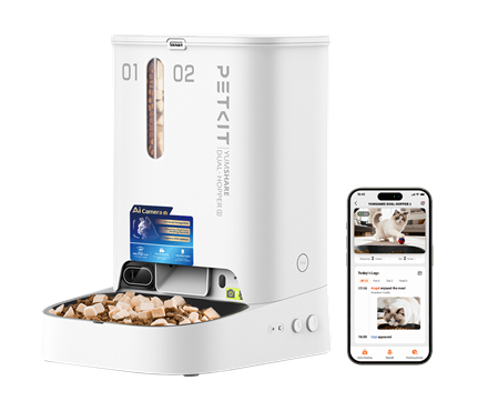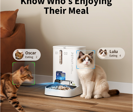 Atnaujintas PetKit P591 YumShare Dual-Hopper modelis su 5L šerykla. Pagrindiniai atnaujinimai: DI patobulinimai ir veidų atpažinimas — DualHopper 2 turi