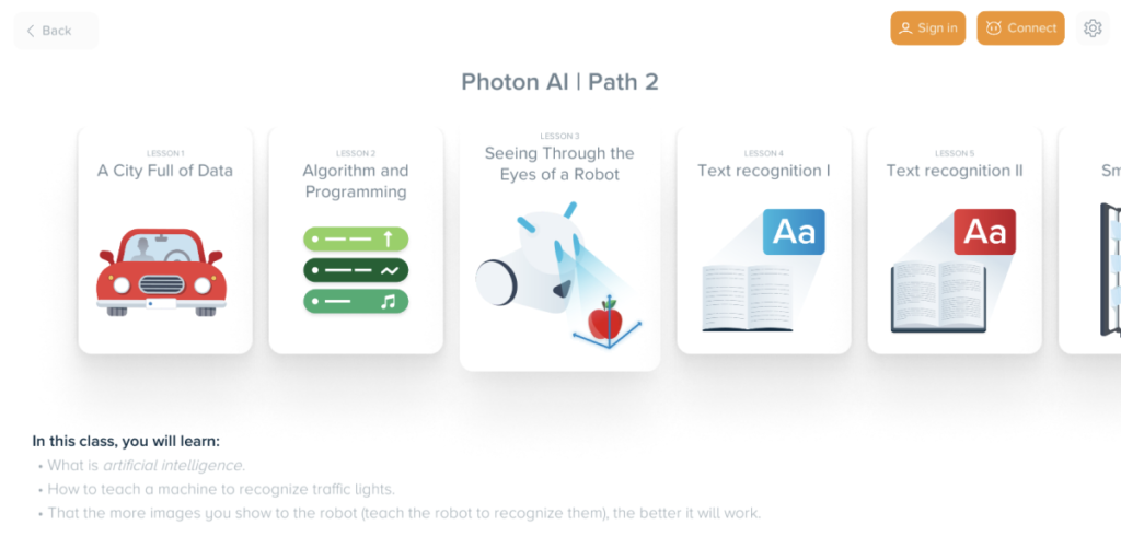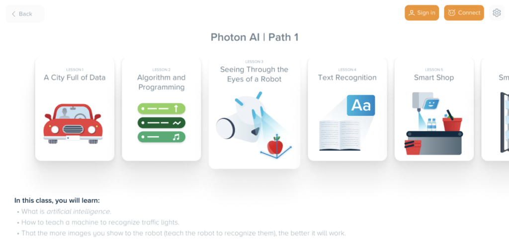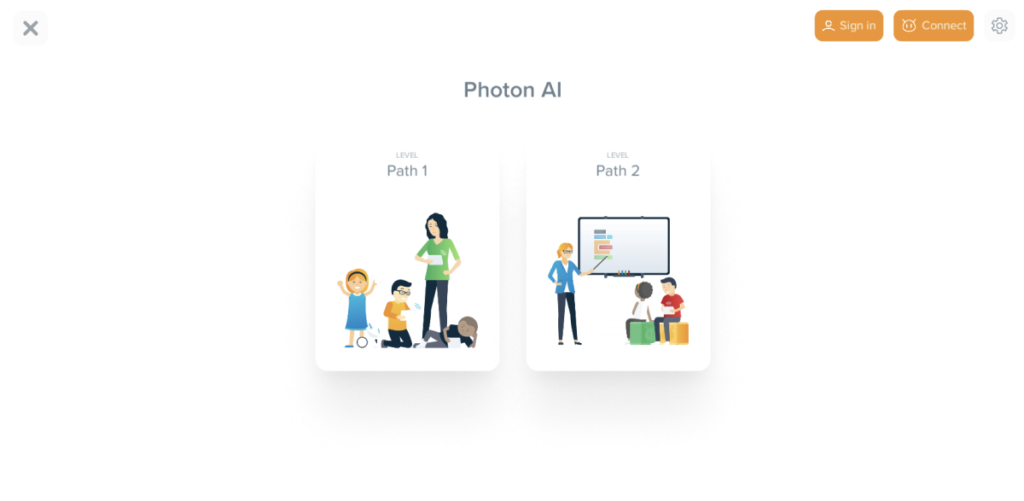 „Photon AI“ programa yra padalinta į du ugdymo kelius, kurių kiekvienas siūlo šiek tiek skirtingą trukmę ir veiklos pasirinkimą. Kiekviename kelyje yra 10 klasių su atitinkamais pamokų scenarijais. Kiekviena klasė suskirstyta į trijų tipų modulius – „Žinios“, „Mokymo dirbtinis intelektas“ ir „Eksperimentai“, leidžiančius mokiniams suvokti dirbtinio intelekto pasaulio pagrindus. Programą galite naudoti bet kuriame Android arba iOS mobiliajame įrenginyje.