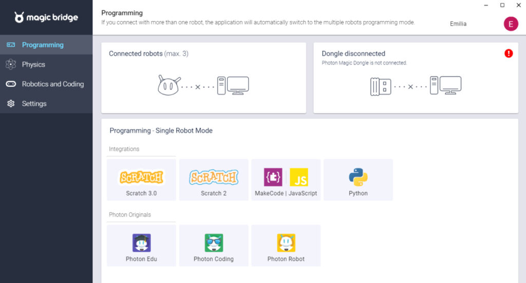 Naudokite specialų „Photon Magic Dongle“ adapterį, kad prijungtumėte „Photon“ robotą prie kompiuterio su „Windows“, „MacOS“ ir „Chrome“ OS. Ši programa apima visas anksčiau aptartas programas. Tai taip pat leidžia toliau tobulinti savo programavimo įgūdžius naudojant Scratch, MakeCode, JavaScript ir Python. Prie vieno kompiuterio galite prijungti iki 8 robotų ir juos programuoti vienu metu! Be to, „Photon Magic Bridge“ leidžia valdyti roboto veikimą naudojant monitorių arba interaktyviąją lentą.