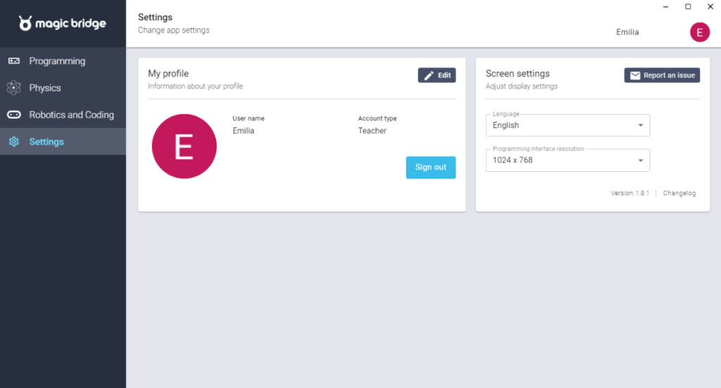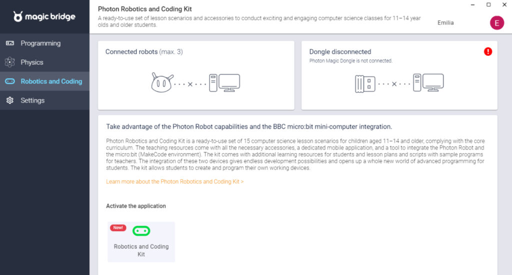 Programėlė, skirta fizikos mokytojams, labai palengvina mokymą naudojant robotus ir įtrauktus pamokų planus. Tam nereikia išmanyti roboto programavimo pagrindų – jis sukurtas taip, kad bet kuris mokytojas visus eksperimentus galėtų atlikti „vienu paspaudimu“. Programą galite naudoti kompiuteriuose su Windows, macOS ir Chrome OS naudodami Photon Magic Bridge. Programos aktyvinimo kodą rasite fizikos mokymo rinkinyje.